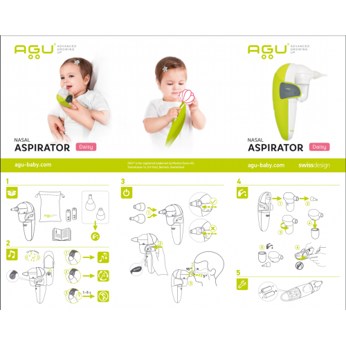 Назалният аспиратор AGU NS12 Daisy е разработен специално за почистване на носа при бебета и малки деца. Удобният мек накрайник на аспиратора (има дълъг и къс) осигурява индивидуален подход и безопасно провеждане на процедурата. Уредът е удобен и лесен за ползване и поддръжка.Аспираторът за нос има 12 мелодии, които да задържат интереса и да забавляват малкото дете, като по този начин процедурата за изчистване на носа е по-комфортна за него. Компактният, лек и удобен аспиратор с детски мелодии ще стане ваш надежден помощник у дома и на път.
