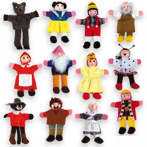 В комплекта има 12 куклички които илюстрират различни герои от най-известните приказки за деца - котарак в чизми, баба, дядо, принц, принцеса, вълк, червената шапчица, джудже, пчеличка и други.