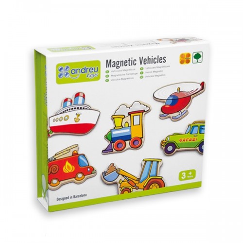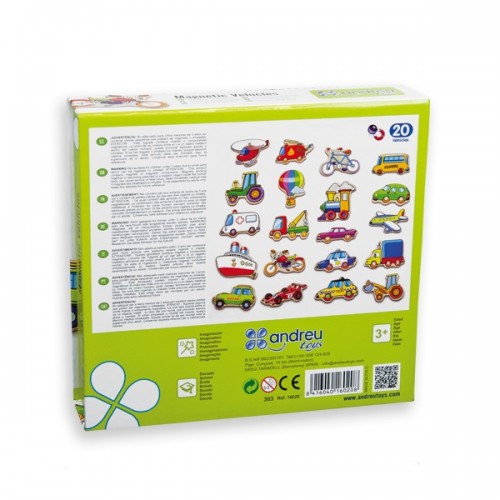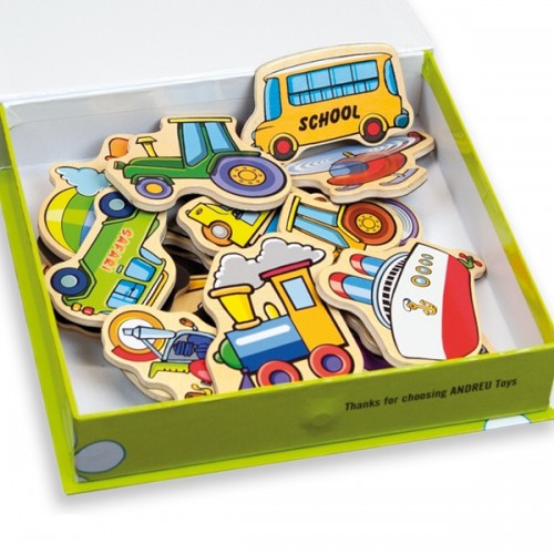 Комплектът включва 20 магнита с превозни средства с височина 8 см. в дървена кутия.
