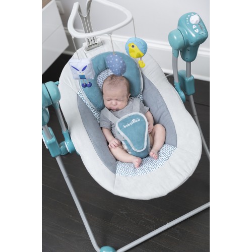 Люлка за бебе, която може да се използва от раждането до достигане на тегло от 9 кг. Има 5 скорости на люлеене и 8 мелодии с регулираща се сила на звука.