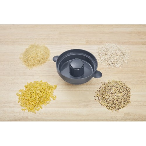 - Съдът за течности е с по-голям капацитет (450 мл), което дава възможност в него да се готвят различни зърнени храни