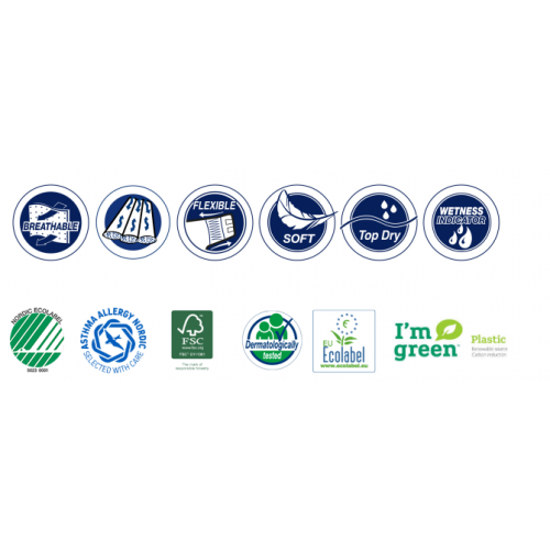 Меки и удобни еднократни пелени, които запазват детската кожа суха. Лентата на талията и маншетите около крачетата не съдържат латекс и спомагат пелената да прилегне перфектно към тялото, като осигуряват комфорт и свобода на движенията на бебето.