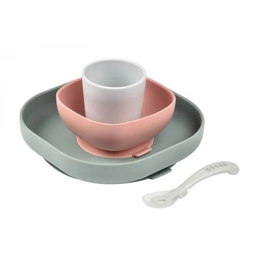 - Комплектът от 4 части включва: неплъзгаща чиния, неплъзгаща се купа, неплъзгаща чаша, силиконова лъжица