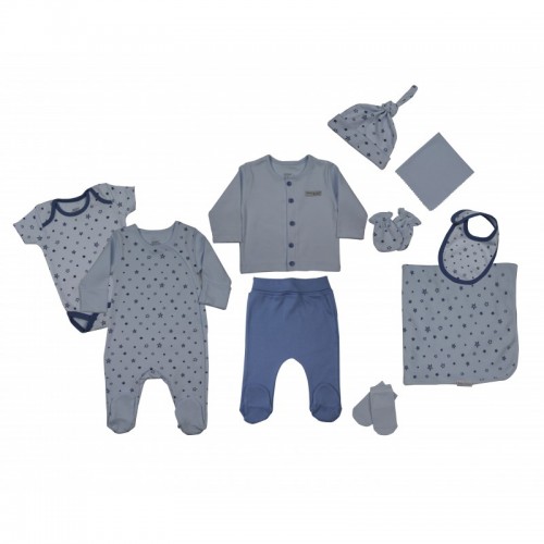 Съдържа 10 части – гащеризон с копчета,жилетка, ританки, боди с къс ръкав, шапка, лигавник, ръкавички, чорапки,малка кърпа и пелена с щампирана апликация.С този сет ще имате два комплекта дрешки за първите дни с бебето.