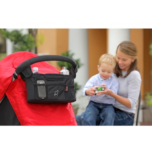 Практичен органайзер за бебешка количка с две отделения за бутилки, които поддържат температурата - топло или студено.