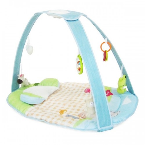 - На арката има 6 играчки- 1 дрънкалка, 1 гризалка и 4 плюшени играчки. Всичките играчки могат да бъдат ползвани и като отделни играчки. Към бебешката гимнастика е включена допълнителна удобна за бебето възглавничка.