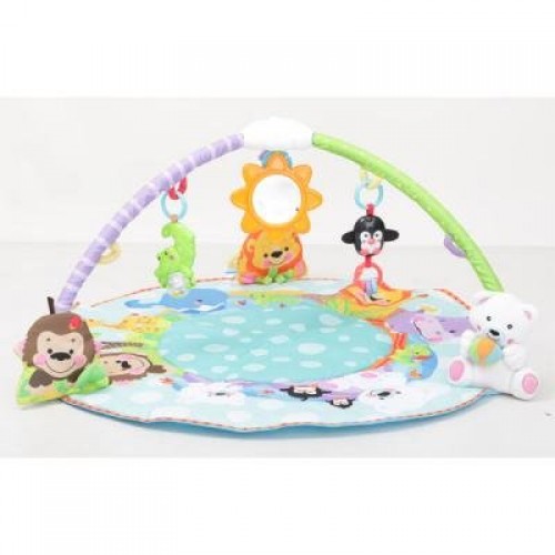 - Различни забавни играчки: мека маймунка върху листа, меко лъвче на трева, музикално мече с батерии, дрънкалки крокодилче и пингвинче, огледало слънчице.