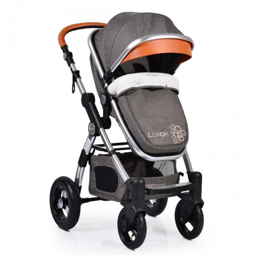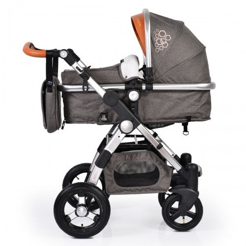 Комбинираната бебешка количка е с алуминиева рамка, четири амортисьора на всяка гума, които осигуряват по-комфортно возене. Комплектът включва покривало за крачета, което се слага и сваля посредством цип, компактна чанта за аксесоари, дъждобран, комарник, помпа за гумите.