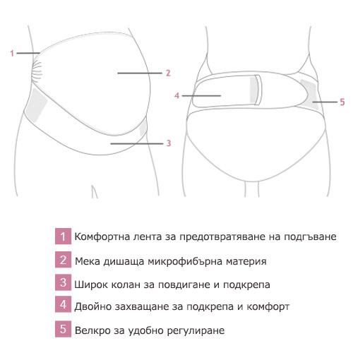 - Широкият регулируем колан нежно повдига твоето бременно коремче и облекчава тежестта.