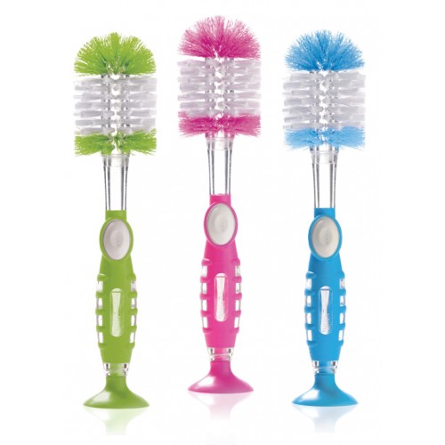 Препаратът се поставя от долната страна на четката. Натиснете копчето на четката и автоматично ще се дозира количеството препарат. Четката измива идеално и труднодостъпните места в шишетата. Дръжката не се хлъзга дори когато е мокра.
