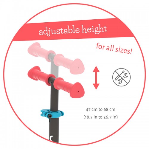 Кормилото се регулира във височина и позицията се сменя без инструменти, така че лесно можете да вземете Scotti с вас или да го приберете. Тротинетката Scotti е лека, красива, забавна с качество от Chillafish.