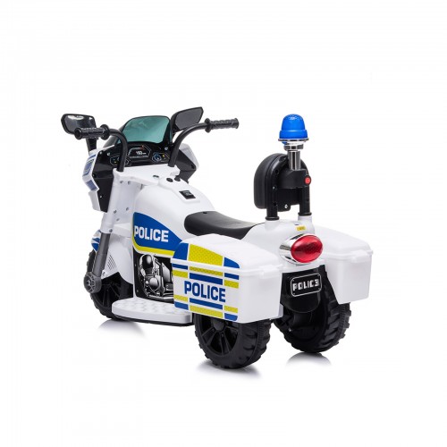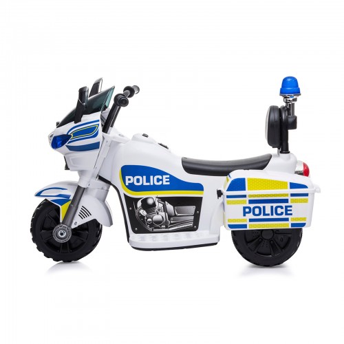 Акумулаторен мотор с реалистичен дизайн и размер, подходящ за деца. Дизайн в бяло и синьо с надписи POLICE и синя полицейска сигнална лампа със звукова сирена за пълно изживяване.
