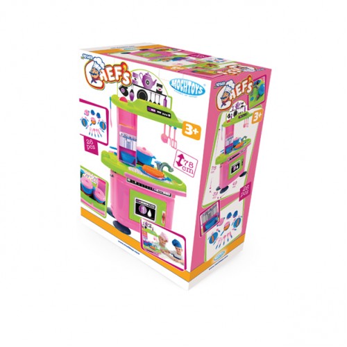 Детската кухня Mochtoys, изработена от пластмаса в различни пъстри цветове e интересен, забавен и полезен подарък за Вашето дете.