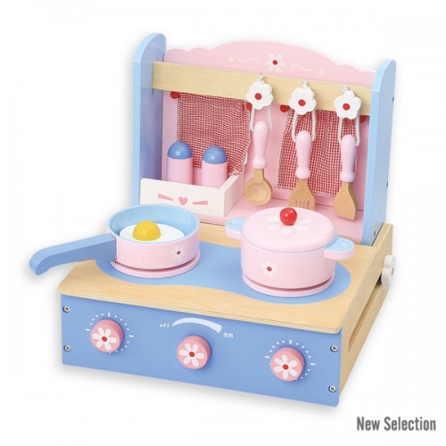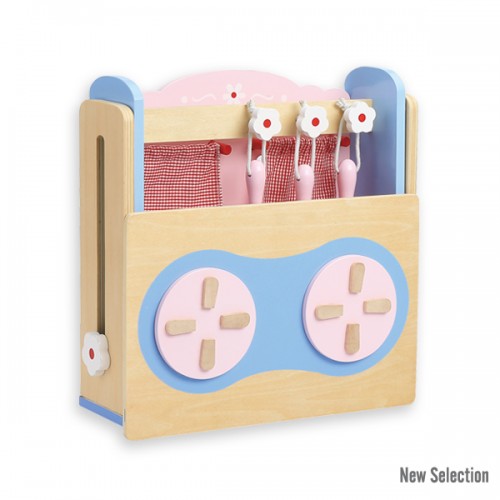 Lovely foldable kitchen for easy portability and storage. A complete set of kitchenware is included. Knobs turn & make a click sound. Includes a wooden cook top with dials and a hanging flower rack handle. Brightly colored, smooth-sanded wooden pieces.Measures: 30 x 28 x 30 cm. Packaging: 34,5 x 34,5 x 14 cm.