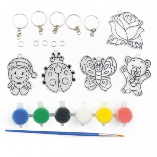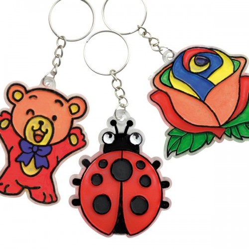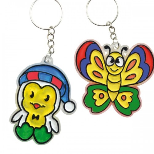 Paint stain-glasses and create keyrings. Content: stain-glasses, paint brush, paint, key rings and iron circles.