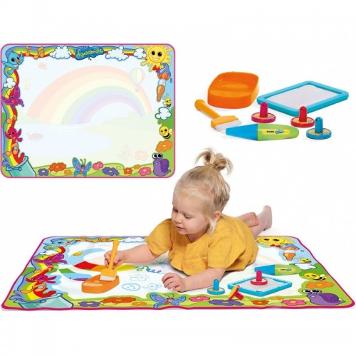 - Included in the set is a special paintbrush that lets you make broader strokes, as well as three stampers for added mess-free fun. When you’ve finished, the 65 x 85 cm mat folds up for easy storage. Additional Aquadoodle pens sold separately.