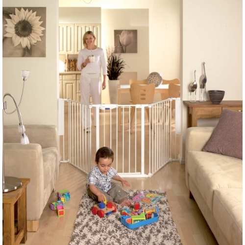 A unique concept developed by Baby Dan with multiple features all in one product. The extra wide door section separates this playpen from others, allowing you to pick up your child without straining your back or letting it crawl out itself . When you no longer need a playpen, you can convert it into a safety gate, a room divider, or a hearth gate adding wall fittings. Wall fittings and extra sections are available separately.