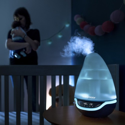 This eye-catching, silent humidifier allows you to check the environment in your baby’s room and make sure the air is healthy while baby sleeps. You can adjust the humidity level by hand or automatically and monitor it along with the room temperature on the backlit touch screen. The Multi-coloured night light is also controlled via the screen. This practical humidifier features an essential oil diffuser too.