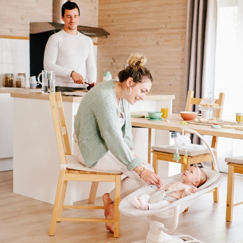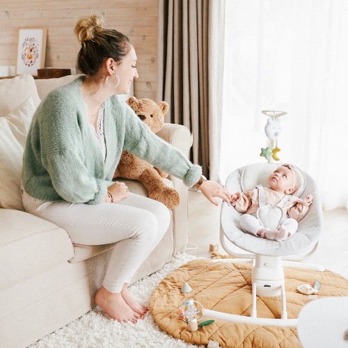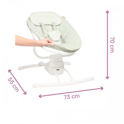 As parents, it's sometimes hard to juggle things in your busy lives: looking after baby, preparing meals, grabbing a little time to yourself...That's why you need the motorised swing – it's like an extra pair of hands!No need to keep one arm constantly free for carrying your baby around! This swing reproduces the soothing movement of a parent's arms, with 3 side-to-side swing speeds. Its headrest and shape designed for newborn babies' backs make this swing ultra comfortable, suitable for when your baby is asleep or awake, right from birth.- From Birth to 9kg (0-6m)
