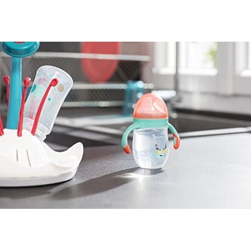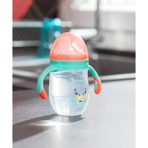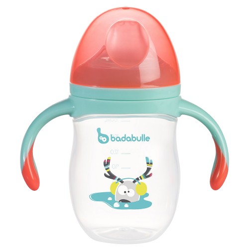 The Badabulle no spill cup is ultra practical.Thanks to its ergonomic handles the baby can learn to hold the bottle. It has a 160 ml capacity and is made of soft silicone with a no spill spout.- 160 ml capacity