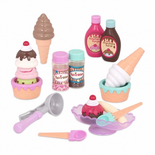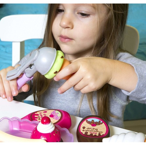 Complete play ice cream scoop set: the sweet treat ice cream parlour set has everything you need for two scoops of fun! This 21-piece ice cream pretend Playset has everything you need to open your own play ice cream shop. Serve up endless combinations of sweet treats decorated with a variety of toppings, all sized perfectly for small hands and big imaginations.Realistic details: feed your child's imagination and creativity with these lifelike food items featuring realistic details like syrup bottles with pop-open lids, jars of sprinkles that shake and make sounds, and an ice cream scoop with realistic working handle that pops out scoops of toy ice cream.Teach and learn: explore a range of life lessons and educational topics with your little one and encourage their imaginations. Designing and sharing their own play ice cream creations lets your child develop creativity, fine motor skills, social skills, and problem solving. Sweet treats ice cream parlour is easy to mix and match with our other pretend food sets for a world of play-food fun!Includes: (4) scoops of ice cream, (2) cream toppings, (2) bottles of sprinkles, (2) syrup bottles, (2) soft ice cream swirls, (2) sugar cones, (1) half banana, (1) banana split dish, (2) ice cream Cups, (2) ice cream spoons, and (1) ice cream scoop.Battat Sweet Treats Ice Cream Parlour