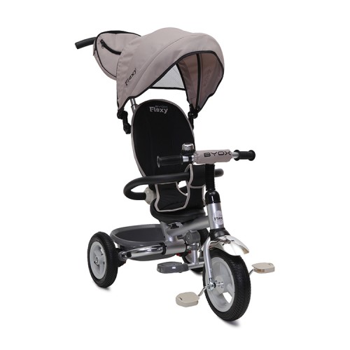 - The tricycle is with adjustable canopy, 2 positions of the backrest, air wheels, two rear brakes, bottle/ cup stand, removable soft seat, accessories bag, toy basket, detachable front safety bar and with the following functions: foldable rear frame, helping for the easier storage and more comfortable transportation (carry) of the tricycle.
