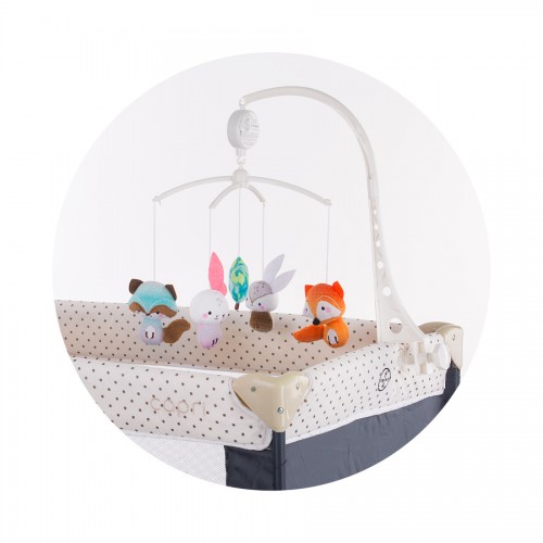 This musical mobile is suitable for newborn babies. Gentle melodies help baby to fall asleep easier. The special soothing motion of the mobile captures baby’s attention and keeps it engaged. Each plush toy dances overhead, baby will love to watch these characters spin. This toy helps visual and hearing development.- Battery operated music box with gentle melodies