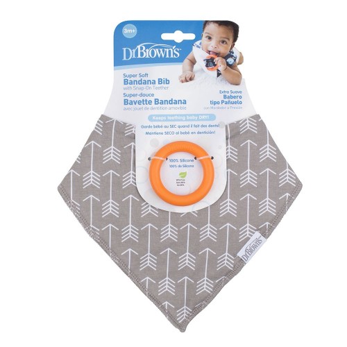 The Dr. Brown’s Bandana Bib offers the whole package: A bib with a 100% cotton front and soft fleece back that keep teething baby dry and comfy, paired with a snap-in 100% silicone teether. The attached teether can be switched out for almost any teether or pacifier with a handle.- Adjustable-fit snap buttons provide the perfect fit