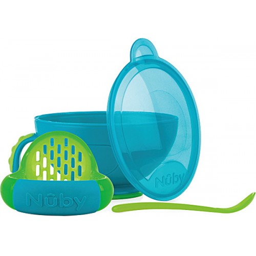 - Easy mash bow with non-slip base, lid, masher handle and long handle weaning spoon in blue and green colours.