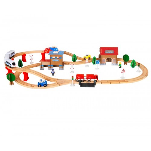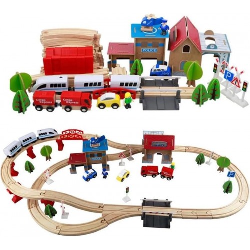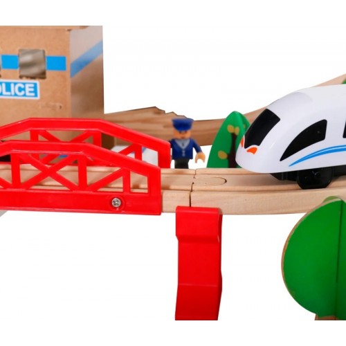 The children's wooden train set is suitable for kids age 3+. It contains 1 electric train with 2 cars, 1 helicopter, 1 cargo truck, 1 police station, rails, bridge, people, trees and more to integrate with the train set.- Suitable from 3 years.