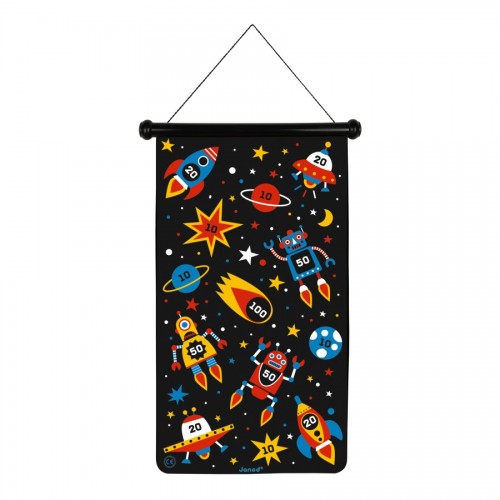 - This magnetic dart game offers 2 levels of difficulty: one side is printed with a giant earth-invading robot and the more difficult side features spaceships and planets scattered across the solar system