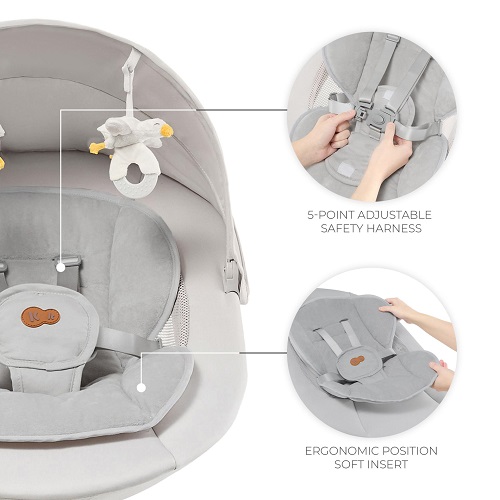 This baby swing comes equipped with remote control operation, Bluetooth, and USB connectivity. It offers 5 swing speeds and an adjustable backrest for your baby's comfort. Lightweight and easy to move between rooms, so your little one can always be close by. It also includes a mosquito net and hanging toys for added comfort and entertainment.- Combines the functionality of both a bouncer and a swing