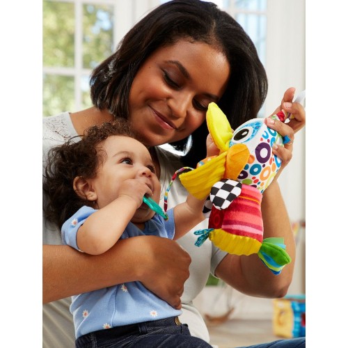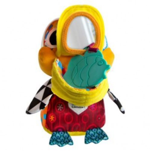 The filled toy Pelican Philip - colorful fun. The pelican's opening opens when he presses his belly. You can play by putting and removing the fish from his cheek. Safe play mirror and facial recognition. Shaking sounds for hearing development. Numerous textures for tactile development. Bright contrasting colors, plenty of textures, and loud sounds help the baby explore it.
