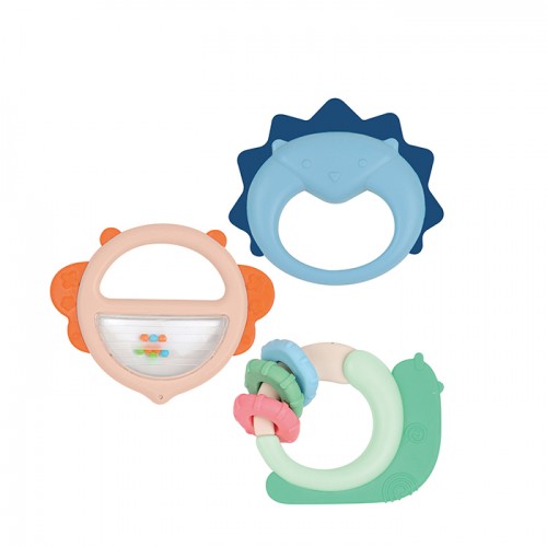 Set of 3 animal rattles, designed to be ultra-easy to grasp. Develops baby’s dexterity. This little set of three rattles is one of those absolute musts to give every baby, to help develop their motor skills. The ability to grasp an object starts with a gripping reflex. Designed for little hands, these rattles are lightweight and very easy to grasp.You’ll find 3 garden creatures: a hedgehog, a snail and a butterfly. Their bright colours are sure to attract your child’s attention. When baby shakes them, they’re encouraged to follow the movement with their eyes. Surprise! The butterfly has lots of brightly coloured beads in its tummy. Playing with the butterfly rattle awakens baby’s visual and hearing acuity, as the little beads can be heard rattling every time baby shakes it.Each rattle has a special part made of soft, flexible plastic, designed to be chewed. They soothe baby’s little teeth, so they’ll love putting them in their mouth. They are very sturdy, so they stand up to rough handling and are very easy to clean.These little toys can be taken everywhere to awaken baby’s senses in any situation.