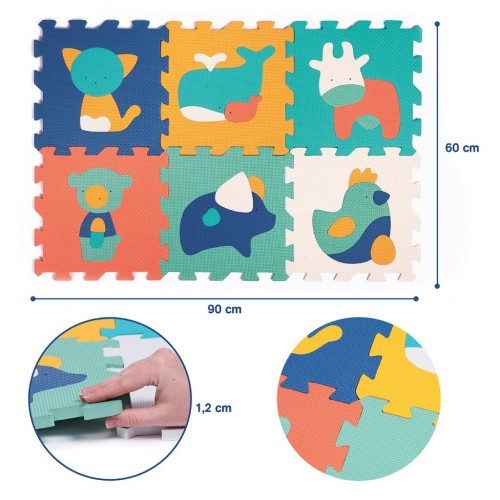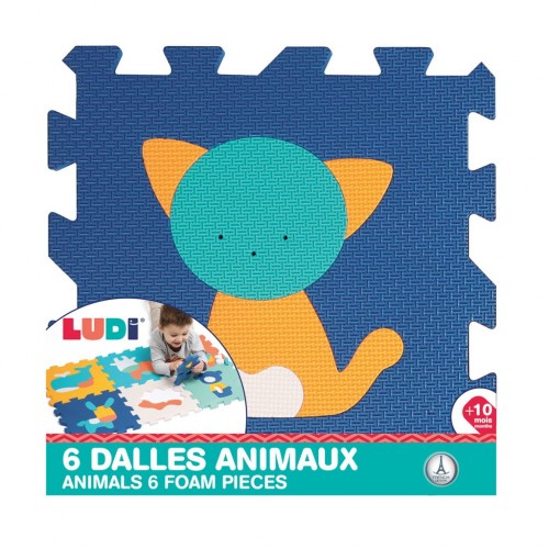 A comfortable surface to play or a big puzzle in 3D? The both! The 6 interlocked tiles isolates baby from the cold and absorbs impacts. Hygienic, indoor-outdoor use.Creative! Baby’s first puzzle to put together or build high, in 2 or 3 dimensions.The 6 interlocked tiles are ideal for crawling on all fours or for having fun with their favourite toys! These sturdy and comfortable tiles (thickness: 1.2 cm) are interlocking and ensure your baby’s safety.It is even more fun when you mix colours and designs ! The pieces that make up this tile are compatible with the pieces for different LUDI products- LUDI 6 Animals foam tiles are comfortable, hygienic and colourful with smooth textures