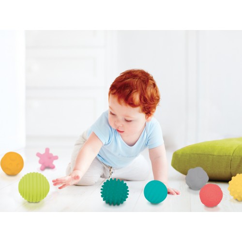 Early childhood learning stimulation has never been more fun! Sensory development has never been so much fun: these 8 sensory development balls in different colours, shapes and sizes are sure to intrigue children. By arousing their curiosity, these balls will also encourage babies and toddlers to move around and develop their dexterity. Sensory balls lend themselves to a multitude of games. Ribbed, smooth or studded, large or small, all balls stimulate the sense of touch, dexterity and coordination of Baby's movements. Their soft and light plastic material alleviates baby's small teeth when teething and guarantees perfect hygiene! Suitable for children from 6 months of age, this set of 8 sensory balls attracts baby's attention and will intrigue them with their pretty bright colours and many textures. Their small size makes them easy to handle. This set of balls allows you to create many opportunities to play, have fun and share moments of family bonding!- Recommended assortment for babies over 6 months of age.