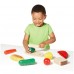 This wooden play food set is perfect for young chefs looking to explore a little mealtime fun--without the mess! It includes eight pieces of wooden food that can be sliced into 27 sections, a cutting board, and a wooden knife. Cutting the food makes a satisfying "crunch"--and provides a playful introduction to concepts of "whole," "part," and fractions.