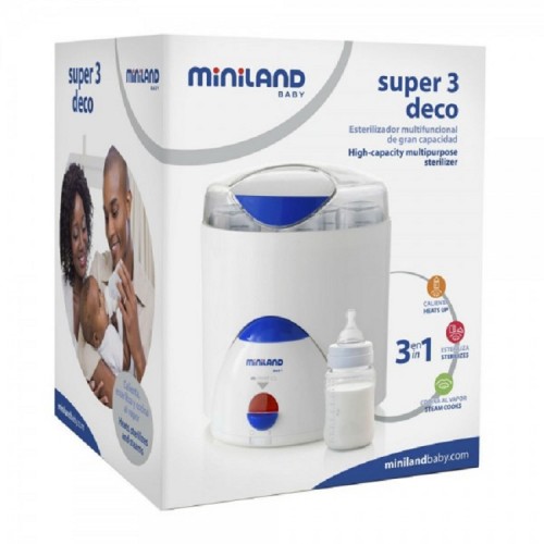 Super 3 deco sterilizes up to 6 baby bottles and their accessories at the same time simply and naturally Its high capacity is due to its large sterilizer that also has an organizer tray and basket. It also heats baby bottles and baby food jars uniformly and cooks with steam.