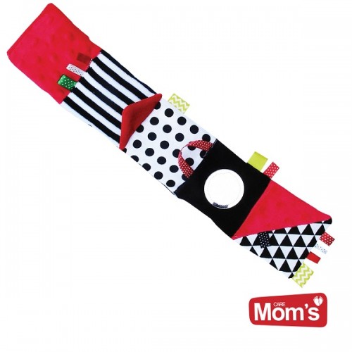 Mom's care Soft Baby book Soft, fabric book from Mom's care collection is aimed at our youngest customers. Full of bold and contrasting colours such as red, black and white it stimulates baby's senses from his first days. This 10 page book is full of surprises with many interactive elements such as making crinkle sound pages, mirror, tags. They will all keep your baby engaged for hours stimulating his development at the same time. It's made with various, soft fabrics with patterns that will keep little fingers interested.- Ages 0+ months