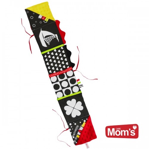 Mom's care Soft Baby bumper book Soft, fabric book from Mom's care collection is aimed at our youngest customers. Full of bold and contrasting colors such as red, black and white it stimulates baby's senses from his first days. This 12 page book is full of surprises with many interactive elements such as making crinkle sound pages and tags. They will all keep your baby engaged for hours stimulating his development at the same time. It's made with various, soft fabrics with patterns that will keep little fingers interested. The book can be easily converted into a bumper to protect your little one and attached to the baby's cot or pram with the provided string.- Ages 0+ months