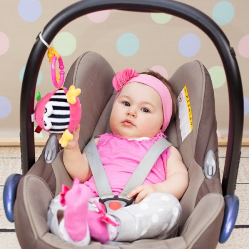 Mom's care Soft Baby Ball is the perfect stroller toy. It wiggles, rattle and shake, keeping baby engaged! Its embroidered eyes,arms and taggy teeth resemble a smiley animal. Bright colours contrasting with black and white stripes stimulate the baby's senses. A rattle hidden inside of the ball gently catches baby's attention. It motivates to play, shake or throw, educating at the same time. The ball is soft which encourage the baby to grab and pass it from one hand to another.- Ages 0+ months