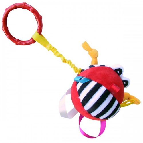 Mom's care Soft Baby Ball is the perfect stroller toy. It wiggles, rattle and shake, keeping baby engaged! Its embroidered eyes,arms and taggy teeth resemble a smiley animal. Bright colours contrasting with black and white stripes stimulate the baby's senses. A rattle hidden inside of the ball gently catches baby's attention. It motivates to play, shake or throw, educating at the same time. The ball is soft which encourage the baby to grab and pass it from one hand to another.- Ages 0+ months