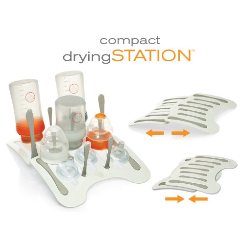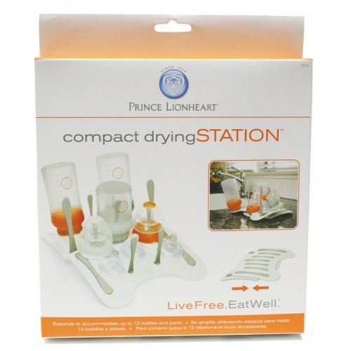 Prince Lionheart's clever, space saving design requires minimal counter space. The compact drying station can be used when collapsed or expanded, making it the perfect drying solution for one or several bottles. Twelve drying arms easily raise and lower to create as much space as needed. When not in use, collapse and store. Expands to accommodate up to 10 bottles and parts.