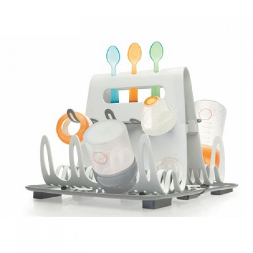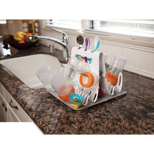 - A modern space for everything: 8 large bottle/cup hooks, 10 small collar/teether/binky hooks, 2 grates for nipples/lids, 3 utensil/straw holes