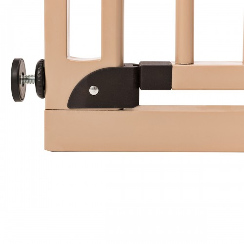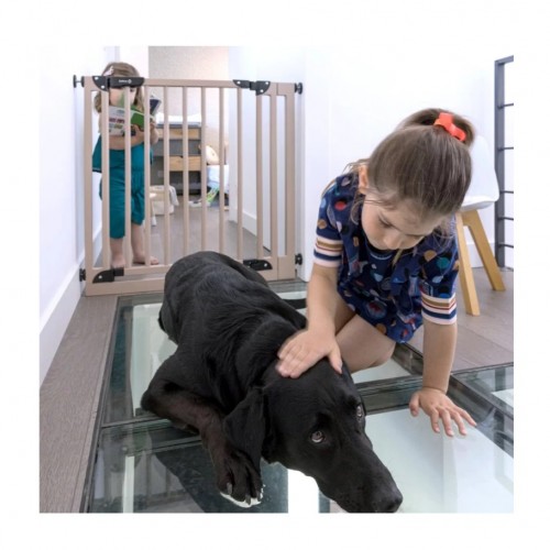 This gate is quick and easy to install thanks to its 4-point pressure fitting and its over-molded screws. It is very easy to use, with a one-handed opening system. This gate will fit any interior thanks to its wood design.- One-handed opening