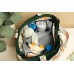 A capacious bag for an active mum that fits a modern stroller. It was made of excellent materials with the utmost attention to detail. The spacious interior will allow you to fit all the accessories necessary during a walk. Internal compartments help you organize your utensils so that they can be easily found. The bag is equipped with shoulder straps, one long strap and two handles that allow you to attach the bag to the handle of the trolley.- Made of a combination of colored cotton and velvet fabricinterior