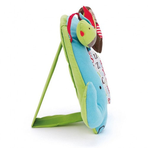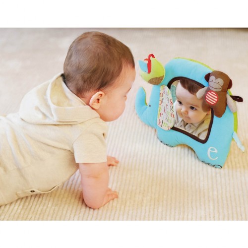 This large, baby-safe mirror is surrounded by a soft and friendly elephant. Plush fabric and the elephant's crinkle ear are soothing to touch as baby plays peek-a-boo and learns to recognize her or himself. With its stand and straps, you can set up the mirror anywhere. And for more fun, a playful monkey rattle and his birdie sidekick are there for baby to grab and stick around the mirror.