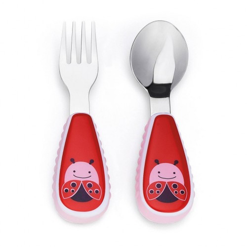This adorable fork & spoon has soft side grips so it's easy for little ones to hold. Stainless steel heads make the utensils feel very grown up for little ones!