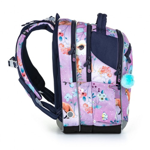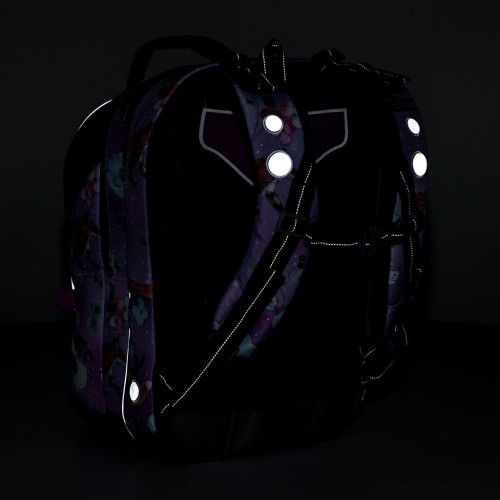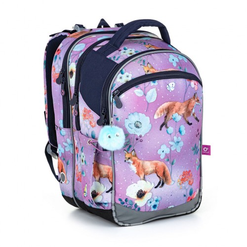 Topgal school bag, backpack with three compartments. Size suitable for 2nd - 4th year of school reflective safety strips for high visibility comfortable and adjustable shoulder straps with chest strap ergonomically-padded back support system with detachable aluminium frame, front pocket, elastic mesh bottle holder on one side, inner pocket and key snap hook.Plastic feet to stabilise and protect the backpack when in the standing position.