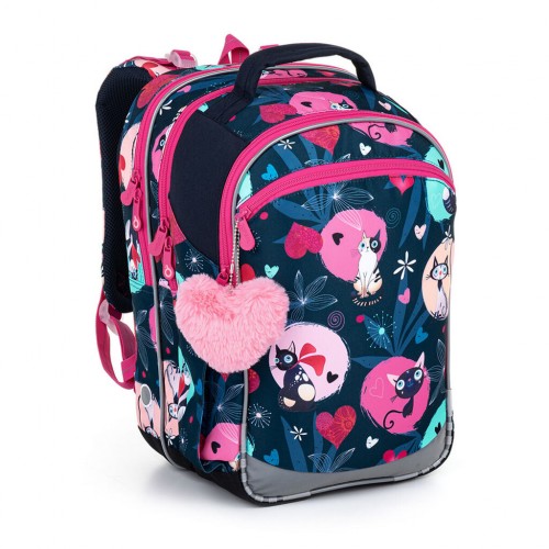 Topgal school bag, backpack with three compartments. Size suitable for 2nd - 4th year of school reflective safety strips for high visibility comfortable and adjustable shoulder straps with chest strap ergonomically-padded back support system with detachable aluminium frame, front pocket, elastic mesh bottle holder on one side, inner pocket and key snap hook.Plastic feet to stabilise and protect the backpack when in the standing position.
